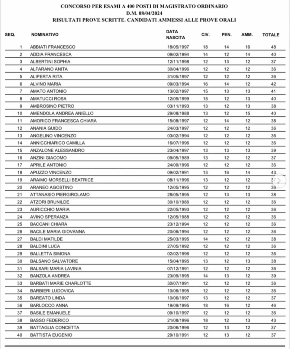 Come anticipato, sono usciti oggi i risultati delle prove scritte del concorso in magistratura da 400 posti indetto con d.m. 08-04-2024. Segue l’elenco dei 569 ammessi agli orali: